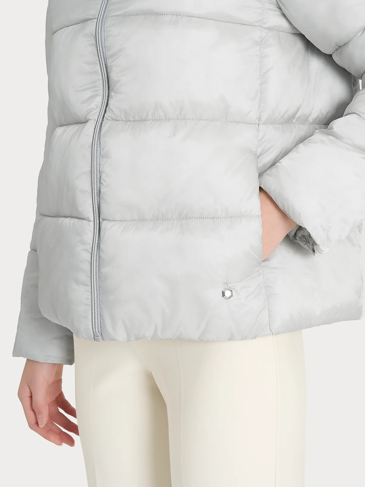 Piumino con collo alto da donna con chiusura frontale con zip e pratiche tasche laterali.